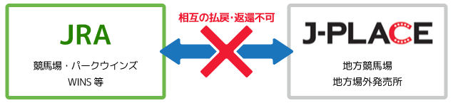 地方競馬共同TZSを利用して発売したJRA勝馬投票券とJRAのシステムを利用して発売した勝馬投票券とでは払戻・返還の互換性がありません。このため、「J-PLACE」で購入したJRA勝馬投票券については、「J-PLACE」にて払戻・返還を受けてください。また、「JRAの競馬場やウインズ等」で購入した勝馬投票券については、「JRAの競馬場やウインズ等」にて払戻・返還を受けてください。