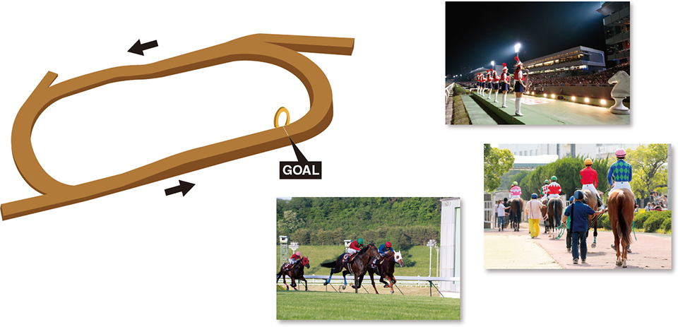 サラブレッドが1周およそ1,000~1,600mのコースを走り、スピードを競う、普段よく目にする競馬のことを「平地競走」と言います。 地方競馬が開催されている競馬場は中央競馬が開催されている競馬場に比べ、1周の距離が短く、コーナーの角度が急なコースが多くなっており、その特徴を生かし、コーナー2つの1ターンで行われる短距離戦なども行われています。