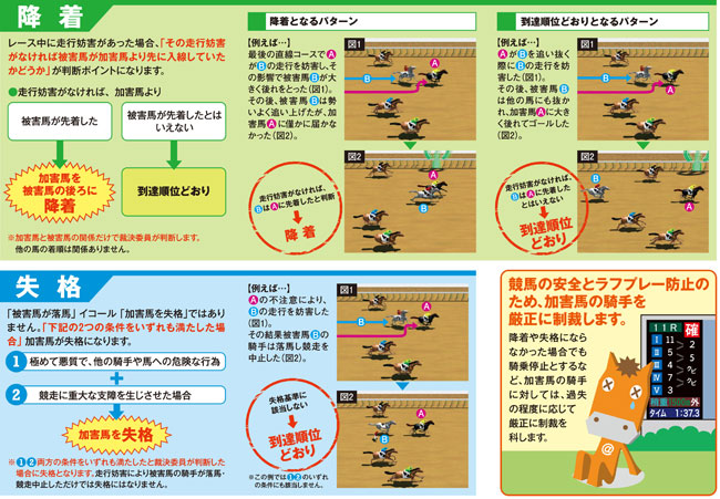 | 失格 | : | 極めて悪質で他の騎手や馬に対する危険な行為によって、競走に重大な支障を生じさせたと裁決委員が判断した場合、加害馬は失格 |