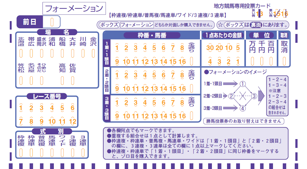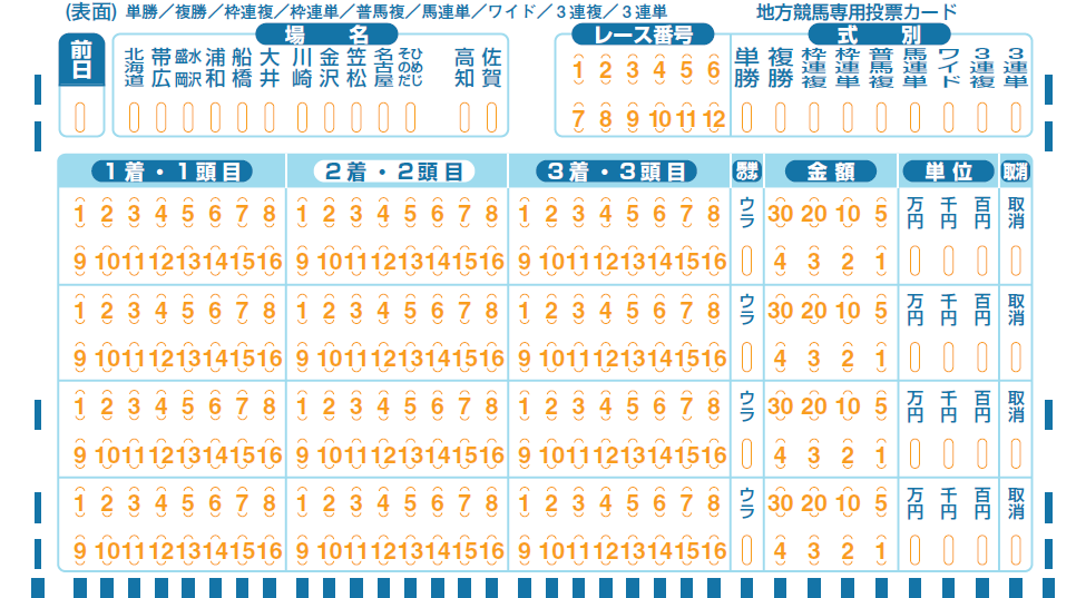 投票カードは競馬場により2~4種類あり、詳細なデザインが異なります。