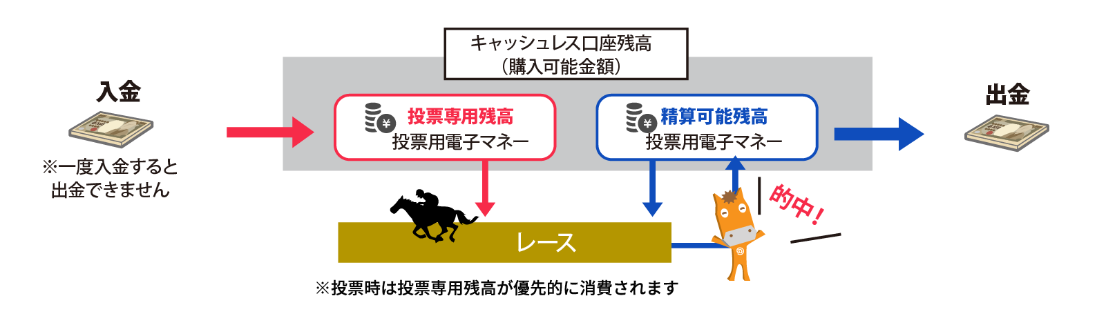 キャッシュレス投票の残高管理について、「投票専用残高」と「精算可能残高」に分かれており、「精算可能残高」のみ入出金機からの出金が可能となります。