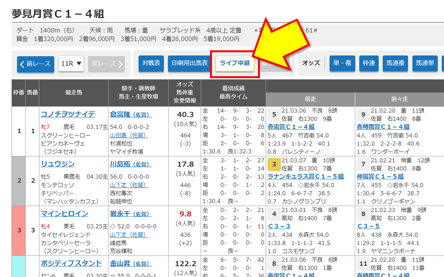 「地方競馬ライブ」は「出馬表」からも遷移することができます。