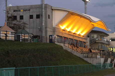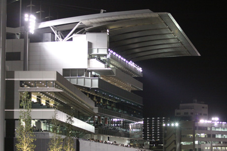 夜になると、照明に照らされた地方競馬最大級のコースが馬産地の夜空に浮かび上がります。