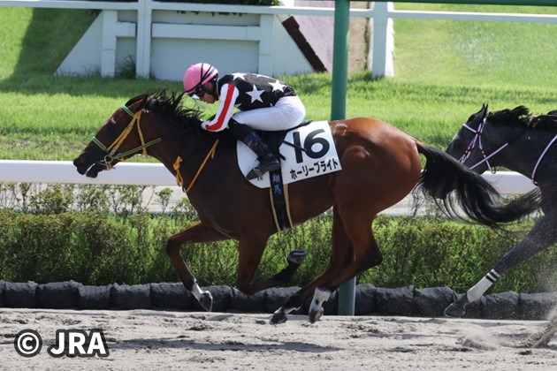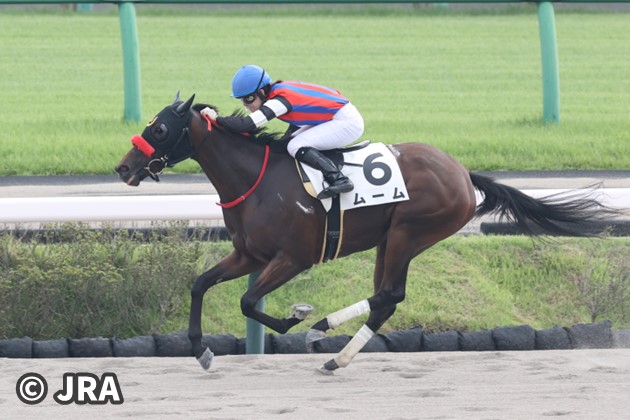 デビュー前の調教ではコーナーで逆手前になって外へ膨れる面を見せ、実戦ではまったく出脚がつかず後方で見せ場のないまま。それが2戦目、ブリンカーとシャドーロールを着けて一変。返し馬から前向きで、レースでも鞍上のアクションに応えてスッとハナへ。早々に後続を離す形になりながらも集中を切らすことなく、最後までしっかり走り切った。勝ち時計が平凡で、時計の短縮は課題だが、良馬場なら1分14秒前後の決着となるこのレースなら対応できそうだし、水を含んで軽い馬場になったとしても、自身、軽快なフットワークで走るので、むしろいい方に出るのでは。前走後の調整も順調で、ゲート練習も積んできた。あとは斤量増をこなせれば。