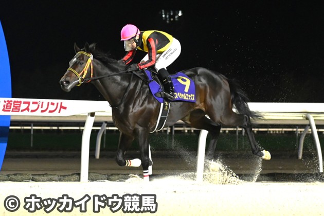 前走の兵庫ゴールドトロフィーは、好スタートから逃げの手を打ったが、向正面で内からハッピーマンに並び掛けられる苦しい展開ながら、4着に渋太く頑張った。兵庫遠征は6回と慣れたもので、長距離輸送による馬体減はなくなった。前走後は門別競馬場の坂路で乗り込まれ、1月17日と1月24日に13-13ペースで駆け上がり、1月31日は3F38.3秒-1F12.5秒と初めて3F40秒を切るタイムをマークした。1週前の2月12日は、僚馬ストリームと併せ、3F35.6秒-1F12.4秒で1馬身先着し、順調度をアピールした。名古屋の馬場は内を避けるケースが目につくが、門別もその状況になることが多いだけに、馬場への適応に不安はない。道営スプリントで勝利に導いた吉原寛人騎手を配し、9回目のダートグレード挑戦で悲願の優勝を目指す。