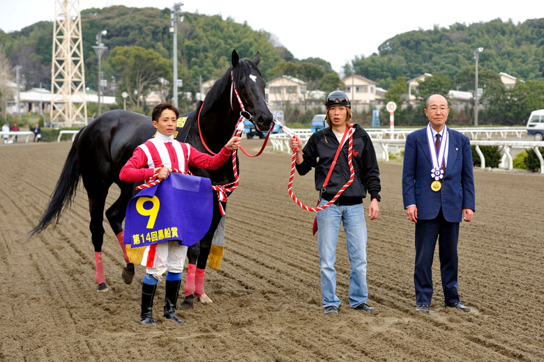 夏休みで大事にしすぎた感じで、調子が上がってくるのに時間がかかりました。デキはよくても結果が伴わないので、ずっと歯がゆい思いをしていました。でも今回は強い相手によくがんばってくれて、前走のフェブラリーステークスのときに思い切り行かせたことがいい転機になったのかなと思いますね。黒船賞を勝つのは2006年のブルーコンコルド以来。このレースの黒い優勝レイが大好きなんですよ(笑)。ブルーコンコルドのように、またJBCを目指していきたいと思います。