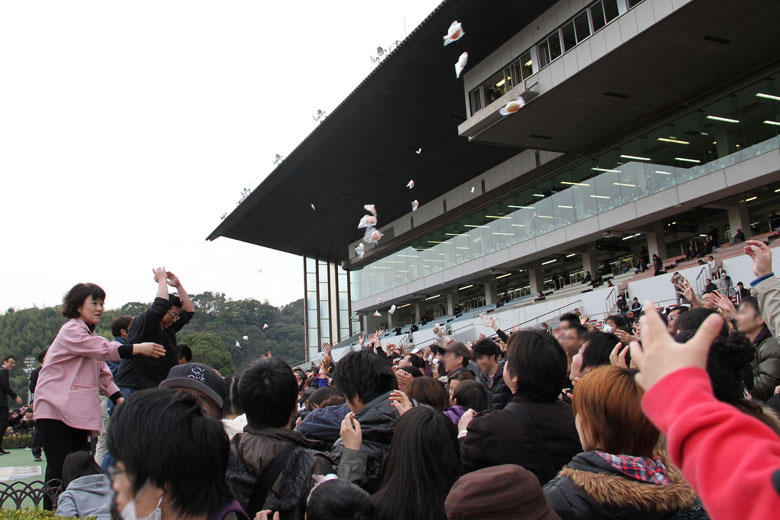 2000人を超える観衆を集めた今年の黒船賞。表彰式のあとには餅撒きのイベントが実施され、再びスタンド前は大歓声に包まれた。年に一度の大イベントである黒船賞の開催日は、まちがいなく高知競馬場が1年でもっとも熱くなる日であった。