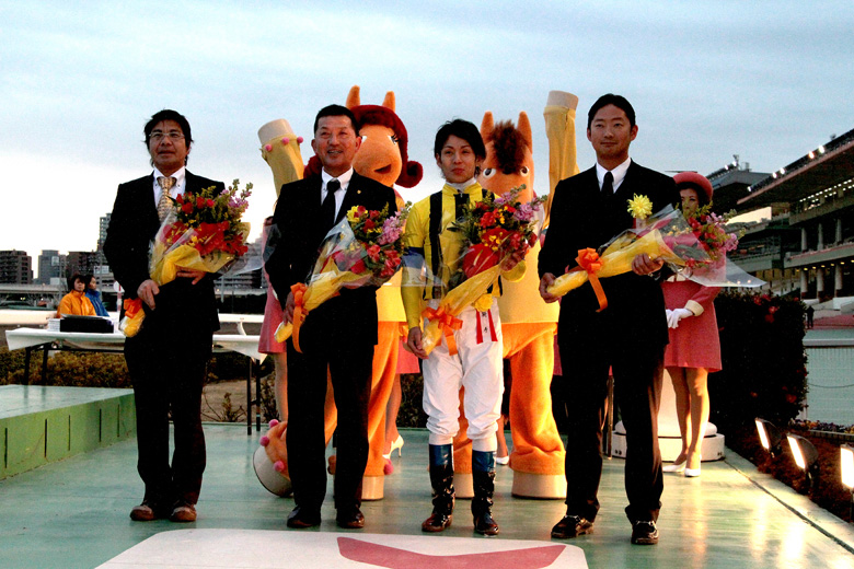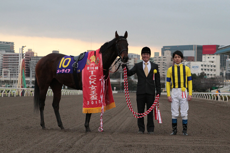 勝ったメーデイアは、今回が重賞初挑戦。デビューからダートを中心に使われ、3着を外したのが2度しかないという堅実な成績を残していた。前走準オープンでも牡馬を相手にほぼ勝ちに等しいレースぶりでの2着だっただけに、牝馬同士ならと期待されての差のない2番人気。圧巻のレース内容には、「思った以上に強い競馬をしてくれたので、びっくりしています」と笹田和秀調教師。初めての関東圏への輸送であり、馬のみならず、笹田調教師、濱中騎手ともに大井競馬場はこれが初めて。それゆえか、パドックでは馬がかなり落ち着かない様子だったという。そうしたハンデを克服して勝ったことや、さらには5歳ながらこれがまだ12戦目と使い込まれていないだけに、今後のダート牝馬戦線では主役を張る存在となりそうだ。