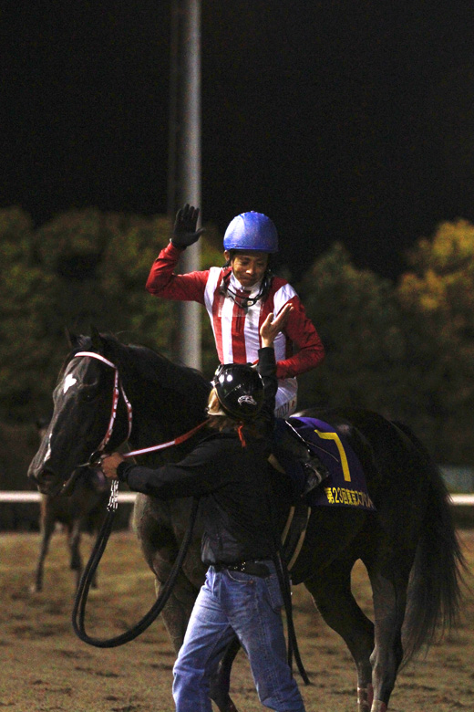 セイクリムズンを勝利に導いた岩田康誠騎手の話が印象的だった。岩田騎手は2年前の春に2度だけセイクリムズンの手綱をとったことがあり、オープン特別の栗東ステークスを勝ってもいる。その後何人かの騎手がセイクリムズンの鞍上となったが、岩田騎手はその間もレースぶりをしっかり見ていて、近走はしばらく勝てないレースが続き、馬が自信をなくしていたと。そして手綱が戻った前走の黒船賞を勝ったことで、今回は馬が自信を取り戻し、レース前の雰囲気からしてまったく違っていたという。逃げても、控えても、どこからレースをしても勝てる。まさにそうした自信のほどがうかがえるレースぶりでの快勝となった。今後も1400メートル以下の地方で行われるダート交流重賞戦線を使っていくとのことで、この路線では中心的な存在となりそうだ。