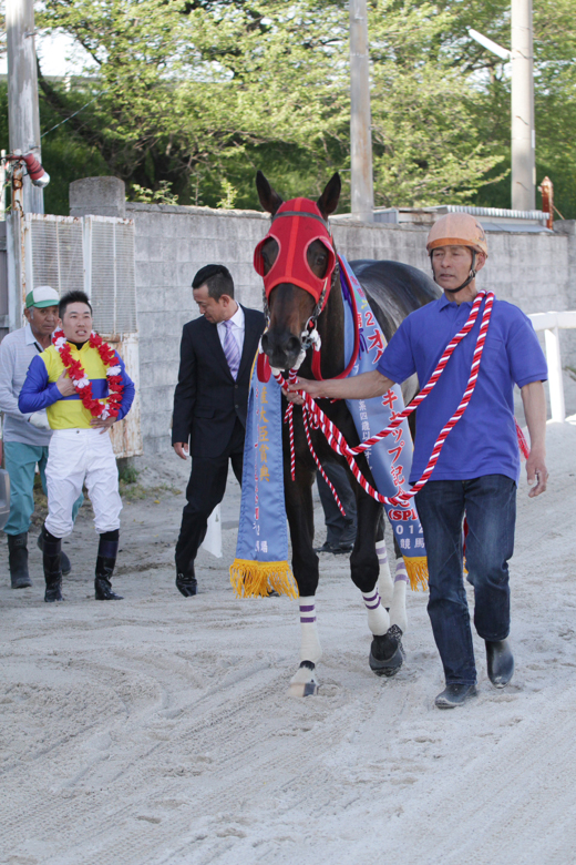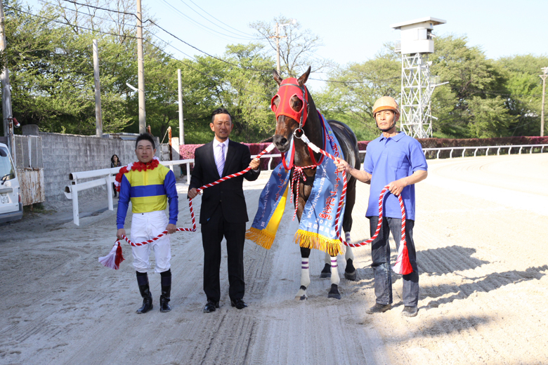 輸送に不安はありましたが、今回は約3時間と距離が近く、川崎と違って当日輸送だったのもよかったと思います。追って伸びるタイプでもないし、終いの脚に賭けようというタイプでもないので、スローな流れで、直線も短く、とにかく展開が向きました。笠松の砂もこの馬に合っていたと思います。