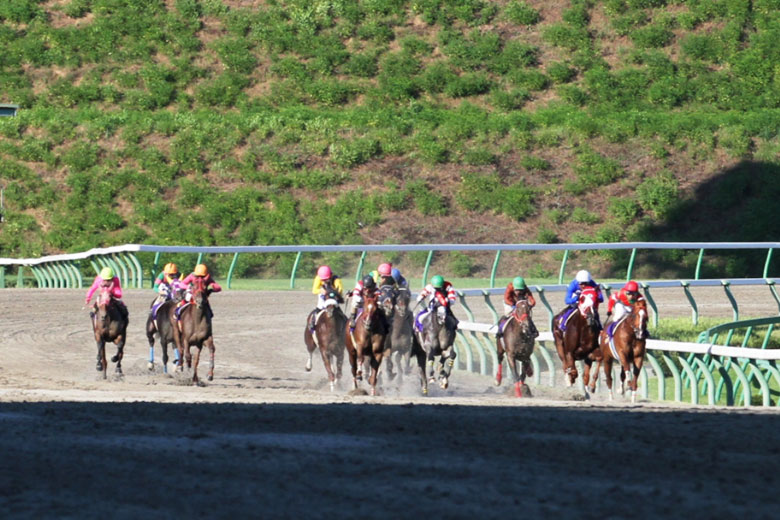 盛岡も関西ほどではないものの、朝方に強い雨が降った。6時すぎには上がったが、馬場コンディションは第1レースから不良。しかしそれも夏の陽射しが強くなるのに伴って解消されていき、第4レースからは重に回復。クラスターカップJpnⅢが行われる頃には、ダートコースの表面は明るい色に戻っていた。