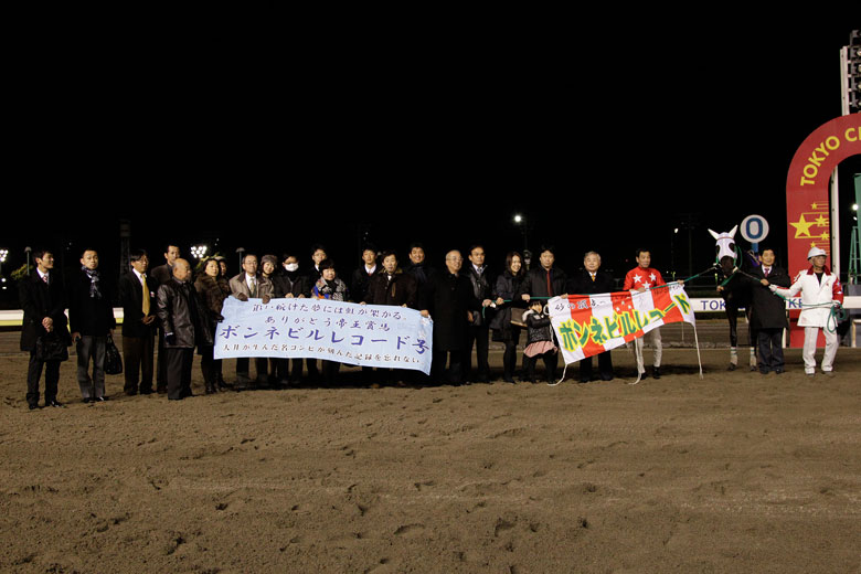 中央在籍時にもボンネビルレコードの手綱をとり、帝王賞JpnⅠ、かしわ記念JpnⅠなどを制した的場文男騎手は、「ほんとうにまじめな馬で、ゴール板まで一生懸命走ってくる馬。それでこれだけの成績を残したと思います」と語った。