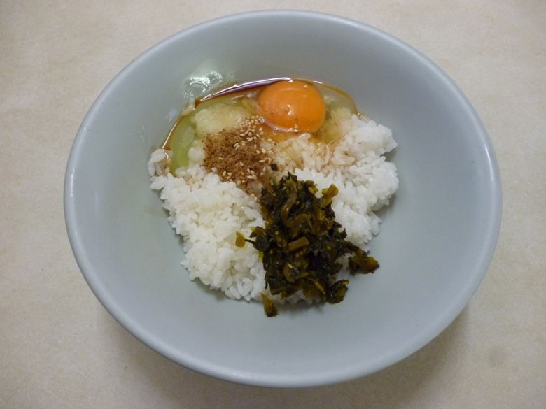 どうやって食べれば最高にウマくなるのかと少し考えたが、とりあえずたまごを軽くほぐして魚粉と高菜を乗っける形を選んで最初の一口。おお、今まで私が食べてきたものとは種類が違うたまごかけごはんだ!