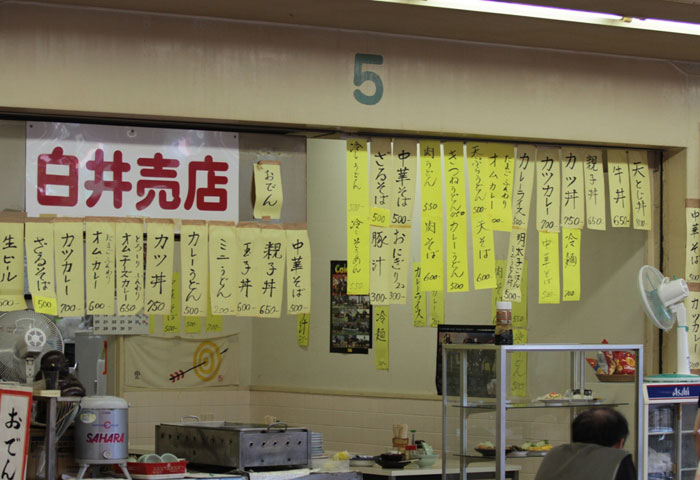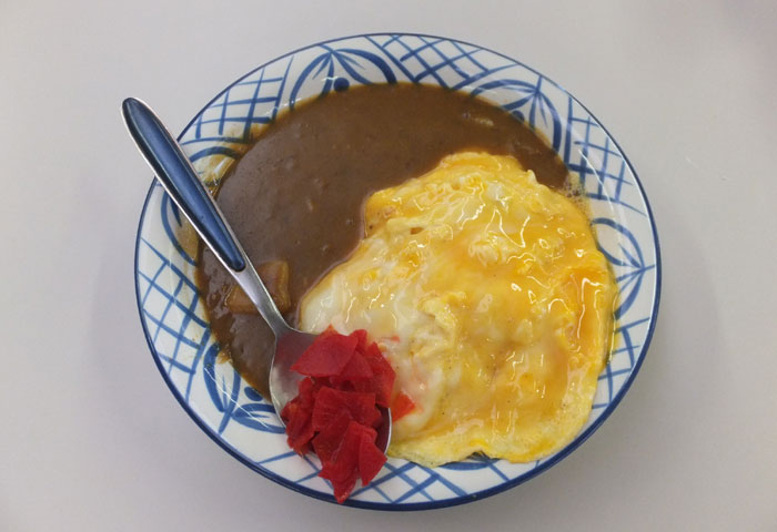 うーん、でもそこに座ると、その店のものを注文せざるをえなくなるような気がするからなあ。どんなラインナップになっているのか、ひととおり見させてくださいな。というオーラを発散させておばちゃんの誘導をやんわりと断り、スタンド寄りの店から一軒一軒覗いていく。選択肢がたくさんあって、迷うくらいのラインナップ。そのなかから、煮物揚げ物焼き物が中心のラインナップとは一戦を画す「オムカレー」を選んでみた。