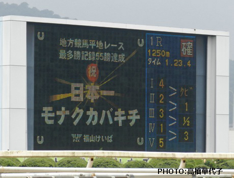 福山競馬場に所属しているアラブのモナクカバキチの存在を私が知ったのは、高知のエスケープハッチ(アラブ、08年2月引退)が達成した地方競馬平地最多勝記録54勝に並んだ頃だったように思います。
