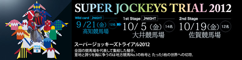 高知競馬場で行われることになったSJTワイルドカードは、各地の勝利数2位(8月31日現在、南関東は5位)の10名に加え、委員会より推薦された選定騎手2名を加えた12名が出場。2レースのポイント制で、SJT出場をかけて争われた。