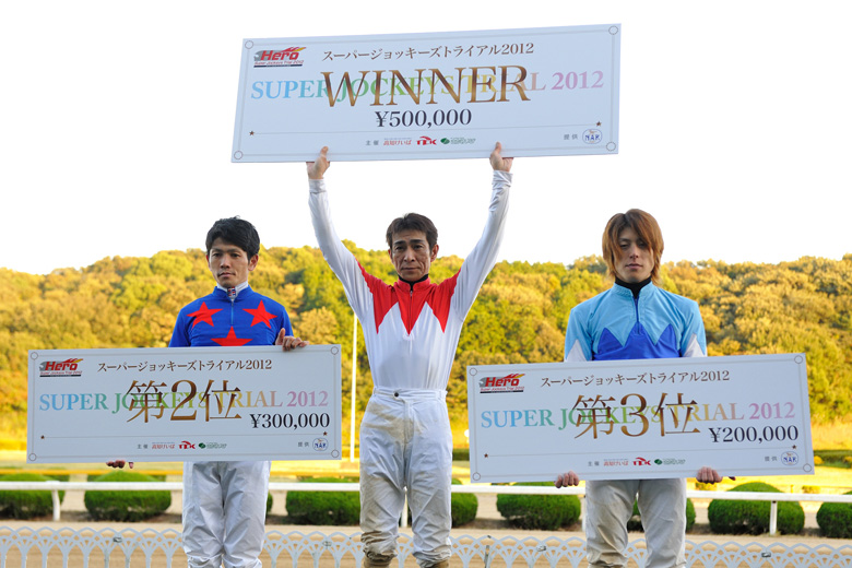 バックヤードではその結果をもとに計算作業が始まったが、誰も確証がもてる数字が出せないという状況。しばらくして、山口、戸崎、三村の各騎手による三つ巴とわかり、そしてついに、山口騎手優勝という確定成績が発表された。山口騎手から1ポイント差で戸崎騎手が2位になり、同ポイントでの3位には三村騎手。今年のSJTはまたしても、競馬の神様のサジ加減ひとつで結果が変わっていたといっても過言ではない、紙一重の結果となった。ちなみに最終戦で山口騎手が8着ではなく9着だったら、戸崎騎手が逆転優勝。また、三村騎手が5着ではなく4着だったら、順位はひっくり返っていた。このシリーズは、どのレースにおいても1頭でも余計に負かしておくことが、最終的に大きな意味をもつ。山口騎手も「大井での3着(12番人気)が大きかったですね」と、それを総合優勝の要因に挙げていた。