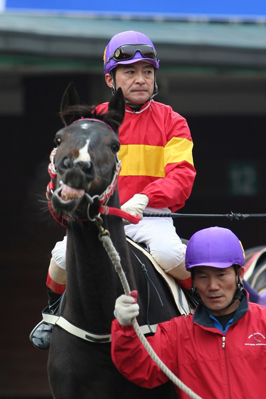 約2年ぶりに2回目の韓国遠征を実現した内田利雄騎手は、2010年11月5日からプサンキョンナム競馬場で騎乗。翌週には大統領杯の騎乗依頼を受けてソウル競馬場にも遠征するなど、いきなり存在感を示して2011年を迎えると、年が明けてほどなく、ある3歳馬の騎乗を依頼された。初めて騎乗した1月21日は、すでにデビューから8戦目。それでも「まだ走る気になっていませんね」と内田騎手をてこずらせたのは、ソスルッテムンというメイセイオペラ産駒だった。勝負どころまでは抑えるのに苦労するほどだったが、直線は必死に追ってもなかなか伸びない。「鞍上がバテちゃうよ」と苦笑しながらも2着した内田騎手は、黙々と調教をこなす反面、教えたことを覚えてくれないという同馬を次走でも2着に導くと、続く3冠の1冠目である4月3日のKRAカップ・マイルを勝利。韓国でのグレード競走初制覇を達成した。メイセイオペラ産駒のソスルッテムンでKRAカップ・マイルを制覇した内田騎手(写真提供:KRA韓国馬事会)