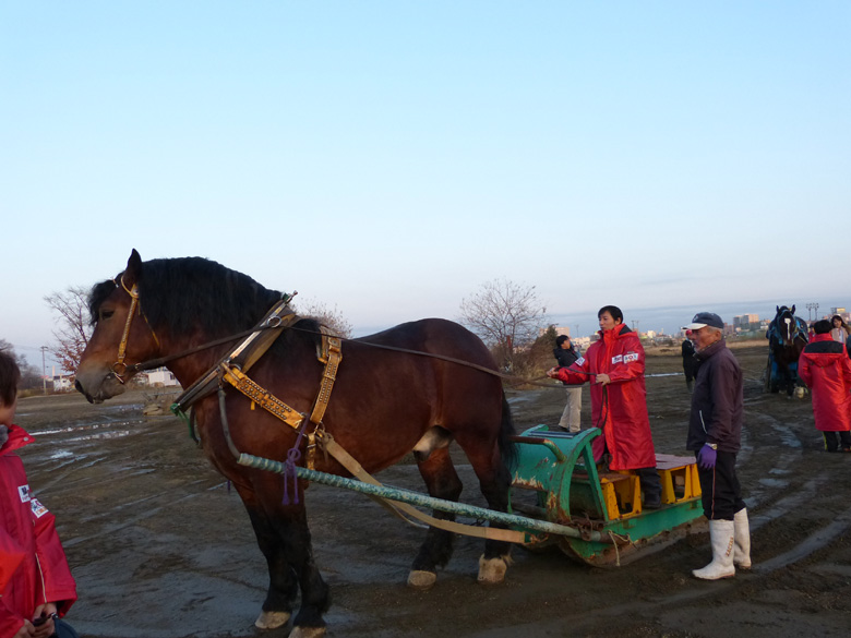 さまざまな掛け声を発するJRAジョッキーズをソリに乗せて、ひたすら前進するばん馬達。映像で見るより、ずっと速く感じる。はあはあ。全力で追いかけないと、併走できないよ~。