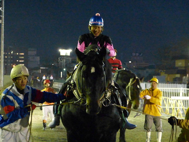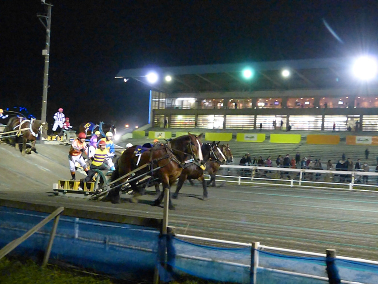 ナイターの照明が点灯して、エキシビジョンレースのパドックが始まった。サラブレッドの倍のサイズのばん馬に、大股開きで跨るJRAジョッキーズ。いつもと違う目線の高さと感触に、自然と笑みがこぼれる。スタート前の様子