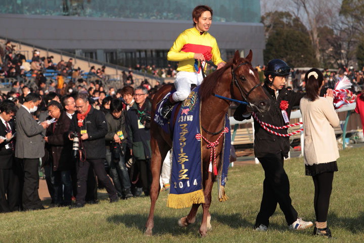 復帰後2戦の惨敗は、砂をかぶったことが原因ではないかと考えていた陣営にとって、外目の13番枠に入ったこともまた幸運だった。逃げるエーシントップが5番枠で、好スタートからその外目の2番手につけ、まったく砂をかぶらないところからレースを進めることができた。競りかけてくる馬もなく、ペースもそれほど速くはならなかった。「エーシン(トップ)が逃げると言っていたので、それを目標に折り合いもついて、人気馬同士が牽制してくれたのもよかったのかも」とは殊勲の田辺裕信騎手。半馬身差まで迫りながら、またもJRAGⅠのタイトルを逃したホッコータルマエの幸英明騎手にとっては、ジャパンカップダートでは早めに先頭に立ってしまい、うしろから来たベルシャザールに差されていただけに、今回もうしろから来るであろうその馬が気になったということはあっただろう。