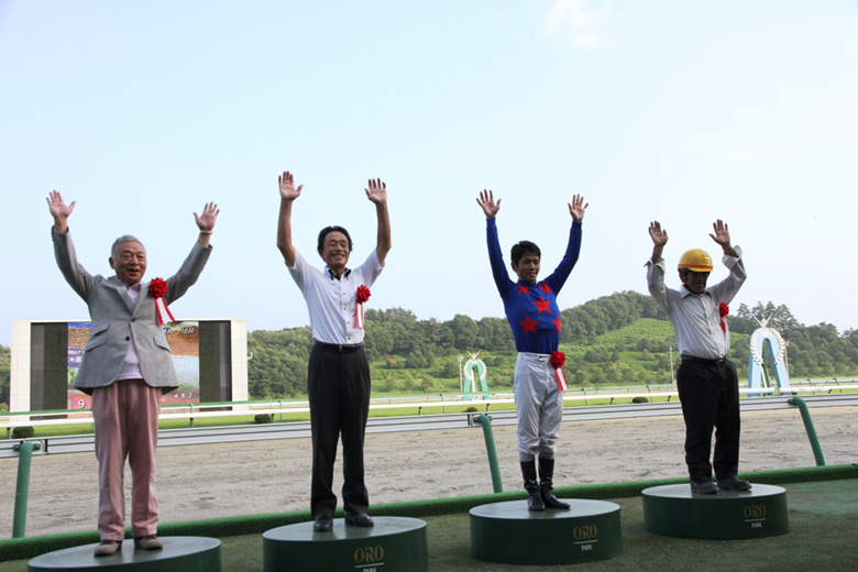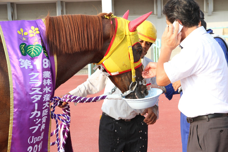 勝ったラブミーチャンだが、今回の馬体重は前走の船橋からマイナス7キロで、今年唯一の惨敗となった黒船賞JpnⅢと同じ502キロ。「昨夜笠松を出発する前に食わせて、船橋より太目にと思っていたんですが、マイナス7キロは意外でした。パドックではあまり汗をかいてなかったので夏負けも心配したんですが、パドックでの足音と、そのあと返し馬は問題なかったということを(スタート前のゲート裏で)戸崎騎手から聞いて安心しました。長距離輸送はこれが最後になりますし、坂を克服してくれたのは、またひとつ手柄になりました」と柳江仁調教師。勝った喜びよりも、むしろ安心した様子が印象的だった。