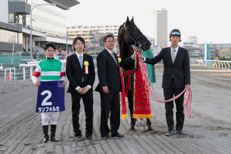 ランフォルセは2012年のダイオライト記念JpnⅡ以来、3つ目のタイトルを手にした。4戦続けてコンビを組んだ戸崎騎手は「着々と調子が上がっていたので、今日は楽しみにしていました」と期待通りの結果に笑顔がはじけた。これまで重賞での着外は2戦のみと堅実な成績を残してきたランフォルセ。近走は実力馬相手になかなか結果が出なったが、状態の良さと地力の高さで久々の勝利を手に入れた。