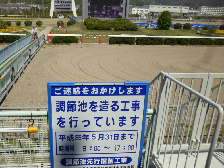 2012年8月30日の開催を最後にレースが行われていない姫路競馬場。今年の開催日数が日本でいちばん少ない競馬場に、平日の昼前に行ってみると、内馬場の駐車場には車が50台ほど停まっているという状況だった。その内馬場では、馬場の東側半分(3~4コーナー方面)を深く掘り下げる作業を実施中。工事の看板には「調節池を造る工事を行っています」という大きな文字があって、その下に「調節池先行掘削工事」と書かれていた。現場を見てみると、ショベルカーの運転席が地面より下だったから、すでに2mほど掘り下げられているということか。しかもこれが「先行掘削工事」ということなら、このあと本体の工事が実施されるということだろう。