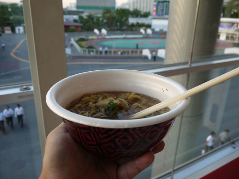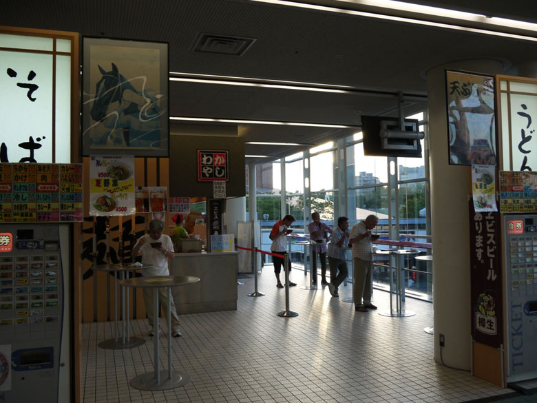 食券を買って、カウンターに出して、数十秒待つと「天ぷらそばのお客さーん」と声がかかる。容器は発泡スチロールだけれど、中身は間違いなく日本の正しい立ち食いそばという感じだ。さっそく箸を入れて口に運ぶと、予想通りの味で安心。てんぷらをつゆにひたして分割して、それとそばとを混ぜながら食べ進めていこう。というところで、ここはパドックを展望しながら食事できるということに気がついた。ていうか、気づくのが遅いでしょ!