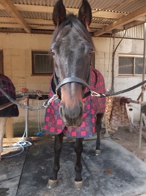 現役時代からおとなしく扱いやすい馬と伺ったことがありますが、今も基本的にはおとなしいそうで、馬房でものんびりしているそう。今年8歳になりましたが、乗用馬としては若手。食欲もあって健康状態も良好とのことです。
