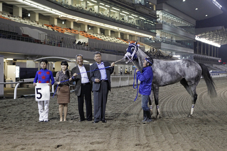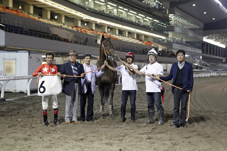 直線に入ってから進路が狭くなって的場が一瞬控えるところもあったから、それがなければ(同着ではなく)勝てたと思う。ただ、負けて悔しい思いで帰るより、同着でも勝てたから気分はいいよ(笑)。力はある馬だし、このくらい走れて不思議ではないから、次も恥ずかしくない競馬はしてくれるでしょう。