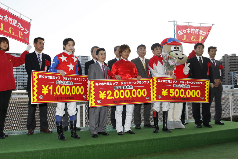 総合順位の上位2名は明らかで、「御神本騎手に勝たれなければ優勝だと分かっていましたが、直線は焦りましたね(笑)」と山崎騎手。1着、3着で83ポイントを獲得し優勝に輝いた。「1着が欲しかった!」と残念そうだった御神本騎手が、2着、2着の76ポイントで2位。3位は、13着、1着で53ポイントの山口騎手という結果となった。
