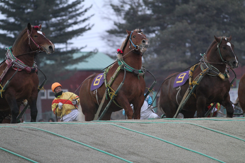 昨年のばんえい記念は、勝ったのが6番人気インフィニティー、2着が8番人気フクドリという大波乱ともいえる決着で、今シーズンのばんえい古馬戦線もそのまま波乱傾向が続いていた。それゆえ総決算ともいうべきばんえい記念も人気が割れ、単勝2.5倍の1番人気こそ昨年の覇者インフィニティーだったが、単勝10倍以下が5頭と、予想を迷っているファンが多かったようだ。前日までに出ていたピンポイント予報では、雪も雨も降らないような感じだったが、当日は朝から雪がちらついていた。昼過ぎに雪は止んだものの、水分量は前日よりやや高めの2.2~2.5%。前半のレースを見ていても、前日よりやや速めのタイムで決着していた。