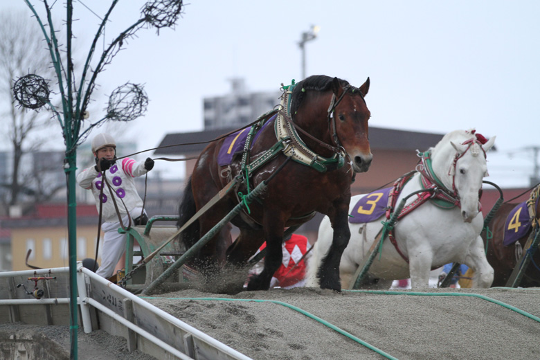 そして迎えた、ばんえい記念。勝負どころの第2障害で各馬じっくり溜めたあと、最初に仕掛けた4頭ほどの中から先頭で越えたのは、ばんえい記念初挑戦の7歳馬フジダイビクトリーだった。同じ7歳のニュータカラコマが2番手で、昨年の覇者インフィニティーも3番手に続いた。