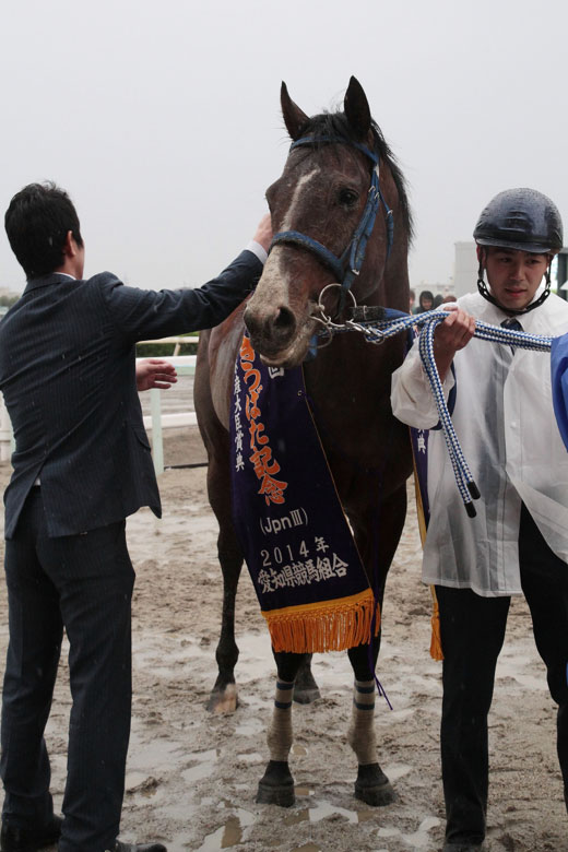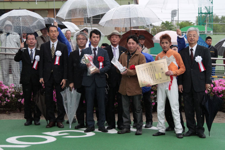大接戦を制し、泥まみれになって帰ってきたタガノジンガロを新子雅司調教師は優しく迎えた。今回はJRAからの転入2戦目。前走は地元の重賞級のメンバー相手に快勝しており、「もともと中央の強いメンバーとも戦ってきた馬ですし、状態も上がっていたのでいい勝負ができると思っていました」とここに向けての期待は高かったようだ。コーナーで張ってしまう癖があるそうだが、バテないことが最大の強味だという。距離は不問とのことから、今後は長い距離も試してみたいそうだ。表彰式のあと、馬主、調教師、騎手ら関係者が輪になり、次走について真剣に話し合っていた姿が印象的だった。選択肢が多いだけに、次はどの舞台に登場するのか非常に楽しみ。「これで一気に地方の星になりそうですね」という報道陣の言葉に新子調教師は「そう言ってもらえるようにがんばります」と表情を引き締めた。