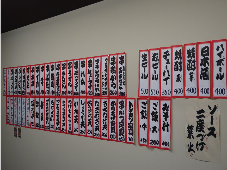 「お店の壁に貼ってあるメニュー表は、青芝フック師匠に書いていただいたものなんです。オープン当初は串カツも12種類ぐらいだったんですが、だんだんと増やして今の感じになりました」