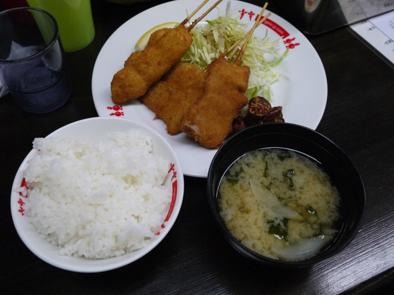 さて、牛すじカレーはおいしかったけれど、ここの本業は串カツ屋。ということで、後日、改めて串カツ定食(650円)を食べに行ってみた。鶏肉、玉ねぎ、ネギ豚、ウズラの串カツ4品と刻みキャベツ、そしてごはんにみそ汁という定食は、満足度の高いメニューだった。