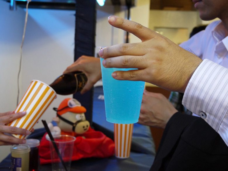 でも食べるその前に、写真を撮らねば。場所は1号スタンド2階で催されているガールズバーの机を借りよう。けっこう賑わっているなあ。