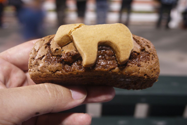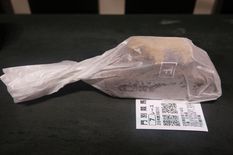 ということで、カウンターに置いてあったショコラを店のおねえさんに手渡してもらい、さっそく外のポラリスデッキに出て写真を撮影。うん、ちょうどいい感じの大きさだなあ。そして包み紙を開くと、ケーキの上に馬のクッキーが載っている。ありゃ、馬の首のところが折れている……って、こりゃショック。でも結局は食べてしまうんだからまあいいか。写真撮影の作業が終わり、それではショコラをゆっくりといただきましょう。うーん、ほんのり甘いケーキの生地はなんだかオトナの味がする。予想と観戦で熱くなった心身をリセットするのにもうってつけですな。おかげでメインレースは大的中。やっぱり競馬場で戦うときには、適度なブレイクがすごくたいせつ!