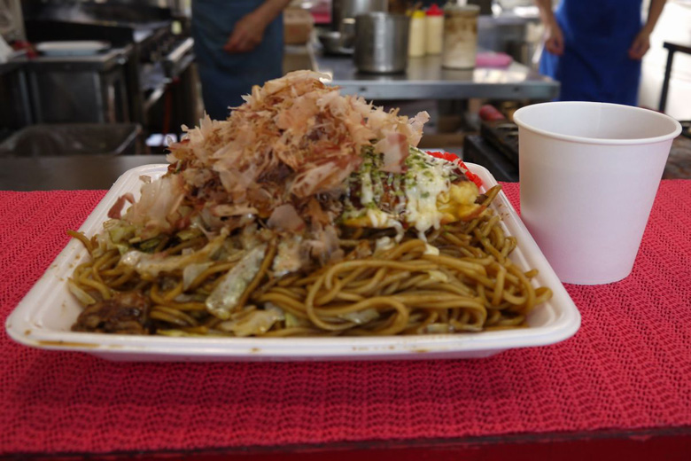 続いて野菜と麺を投入。注文してから調理を始めるのだが、手際がいいからすぐにできる。「ペア」のもうひとつ、お好み焼きは、すでにできているものを鉄板で温めなおして焼きそばの上に乗せてくれるのだが、こちらもけっこうな厚みが魅力的だ。「去年のJBCのときは作るのがおっつかなくて、すごい列になったよ」という店にはファンも多いらしく、「この間も写真を撮らせてくださいというお客さんが来ましたよ」と、おかみさん。それでは私も写真を撮らせていただきましょう。一緒につけてくれるウーロン茶の紙コップと比べれば、その大きさがわかるかな?