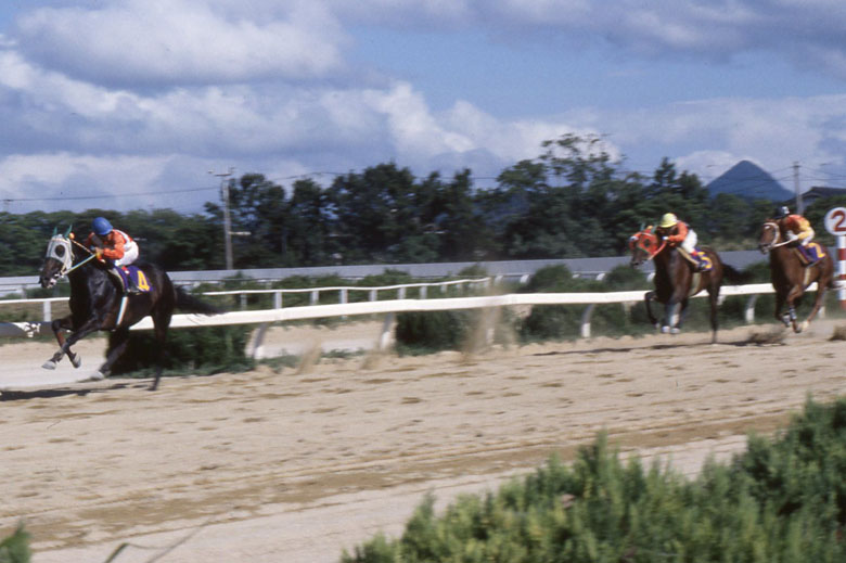 ゲートが開いて、大方の予想通りシルクムーンライトがハナに立つ。鞍上の尾林幸彦騎手が軽く促すと、スッと先頭に出た。やはりスピードが違う。押して2番手にトシノラスター、内からサギヌマスペインも並びかける。出走8頭、縦長の隊列となった。