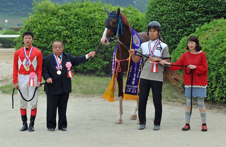 栄城賞がそれまでの佐賀所属馬限定戦から、九州地区交流戦となったのが00年。その後、交流範囲は四国・九州に拡大され、高知からは07年のスパイナルコード(7着)以降、昨年までに5頭(他に出走取消1頭)が栄城賞へ出走。今年は高知から2頭が遠征し、のべ7頭の挑戦でついに高知勢が栄冠を獲得した。