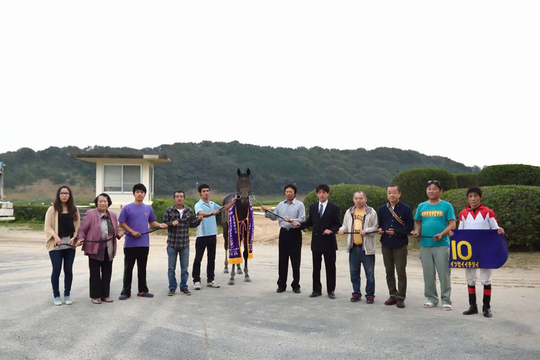 4コーナーで内から上がってきたキングオブザメインと接触して外に膨れてしまいましたが、それがなければもっと楽に勝っていたでしょうね。最初の頃はスタートも出なかったし、まだトモが甘く、最近やっとまともに調教できるようになってきたくらいなので、もっと強くなってくれると思っています。