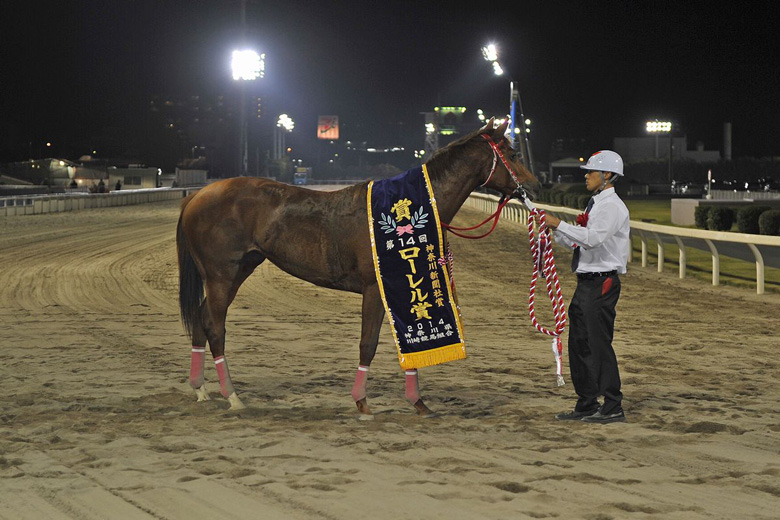 3歳牝馬のロジータ記念と2歳牝馬のローレル賞が一夜にして行われた豪華なひととき。開催ごとに装いが変わる川崎競馬場名物の誘導馬たちも、このダブル重賞は女王のいでたちで魅せてくれた。グランダム・ジャパン2歳シーズンに組まれているローレル賞は、真島大輔騎手がエスコートした4番人気ララベルが優勝した。全姉のショコラヴェリーヌは3年前のグランダム・ジャパン2歳シーズンの女王。ローレル賞は好内容の走りだったが惜しくも2着に敗れているだけに、「お姉ちゃんのかたきを妹が取ってくれた感じですね」と、姉妹をともに管理している荒山勝徳調教師はニッコリ。