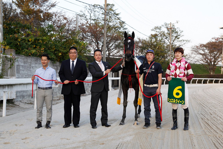 勝ったジュエルクイーンの阪野騎手は、「(広くて直線が長い)門別の馬場なら、自分のポジションを守って、直線いいところを見つけて抜け出すという感じですが、ズブいしコーナーで動いてくれないので、向正面から動いて4コーナー先頭というつもりで乗りました」という。昨年まで名古屋に所属していた阪野騎手は、当然笠松コースの経験もあり、その小回りでの経験がなければ勝てなかったかもしれないと、断然人気にこたえられたことにはホッとした様子だった。