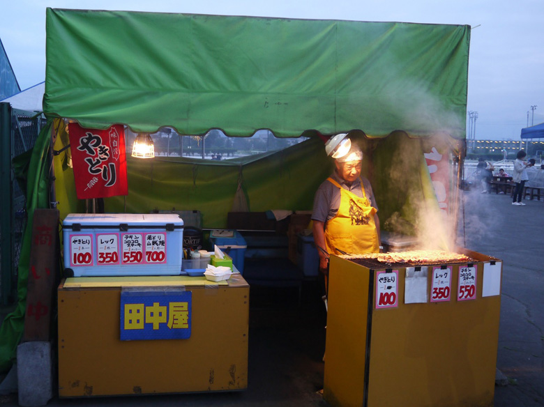 帯広競馬場のスタンド内には飲食店が2つあるが、そのスタンドに入る手前、入場門からまっすぐ進んだところに、緑色の屋台が1軒ある。店先でおやじさんが煙をもうもうと立ち昇らせている網の上には、鶏肉の姿がたくさん。ここは「鶏肉」に特化したお店である。「もう、ここでは8年ぐらいやらせてもらっているかな。前は街のデパートでも店を出していたんだけれど、昨年いっぱいでそちらはやめて、今は競馬場一本ですよ」