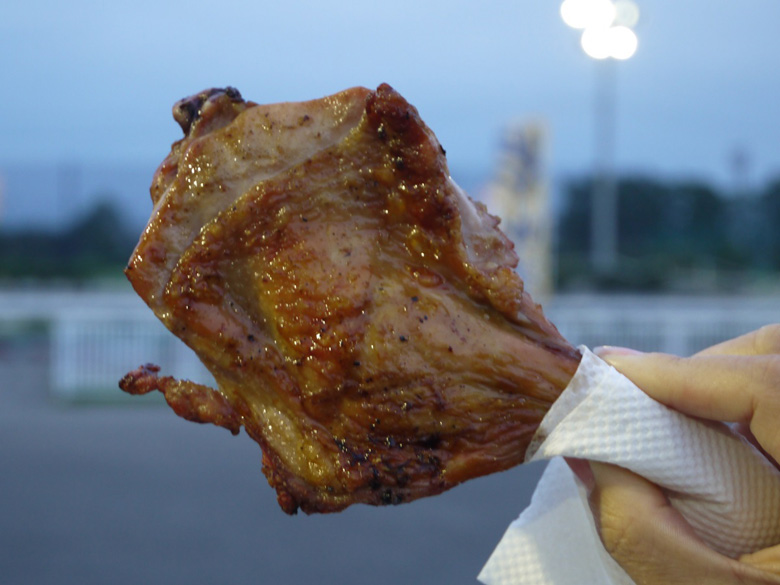 食べているうちから、お皿にたまった肉汁がもったいないと思えて、そして気分的にご飯が欲しくなってきた。そうか、今度はスタンド内の食堂でご飯を買って、その器を持って外に出て、鶏肉を乗せてもらうという手があるなあ。これから気温が低くなっていく帯広競馬場。でも、田中屋さんのコンロでは熱い火が焚かれ続けます!