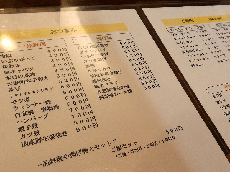 でも私はお食事のお客さん。お水を運んできてくれたお姉さんに「勝丼」と告げ、改めてメニューをみると多彩な一品料理に、多種類のお酒が魅力的だ。おお、向かいの席のおじさん2人組が、つまみにチキンカツを注文したぞ。その様子なら二次会に行く必要はなさそうかな?しかし、これだけたくさんのメニューがあるのに、店内がこの人数ではなあ。経営的に大丈夫なのかしら……。