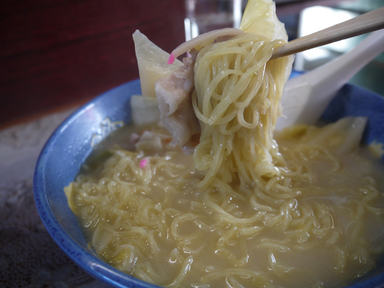 5分ほど待って運ばれてきた「ちゃんぽん」は、見た目はいわゆるチャンポンですなあ。ひととおり写真を撮ってから箸をドンブリのなかに入れると、あれれ、麺が普通の中華麺!