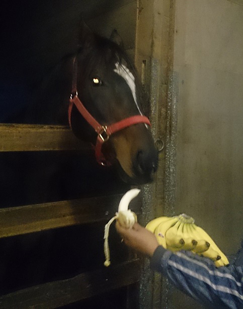 写真はシーズンオフ中に過ごしている鮫川啓一さん(浦河)の牧場にいるときのもので、ファンの方から、産駒重賞初制覇を記念して、大好きなバナナが送られてきたそうです。バナナを前にすると目の色を変えて、幸せそうな表情をしながら頬張る姿は、現役時代と変わりません。
